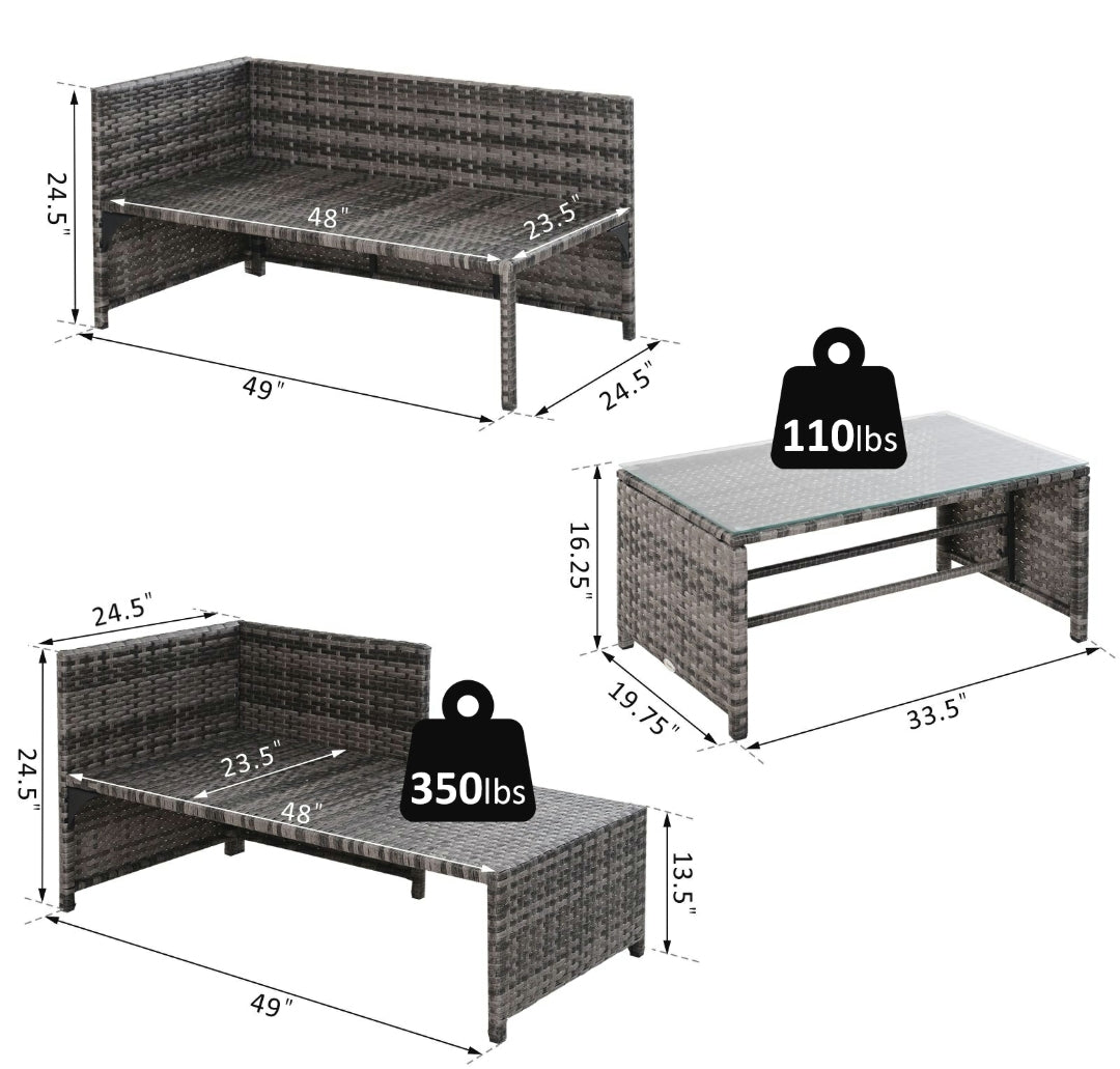 3-Gray Piece Patio Furniture Set Rattan Sectional Wicker Sofa Lounger