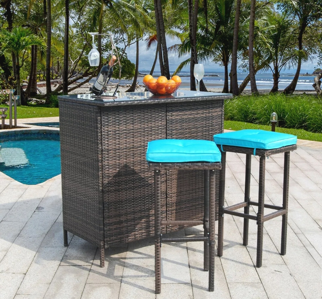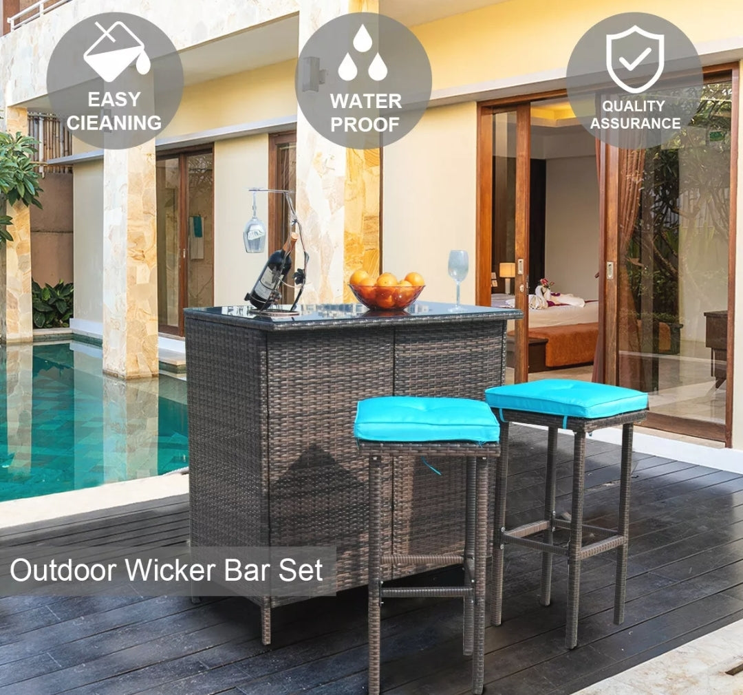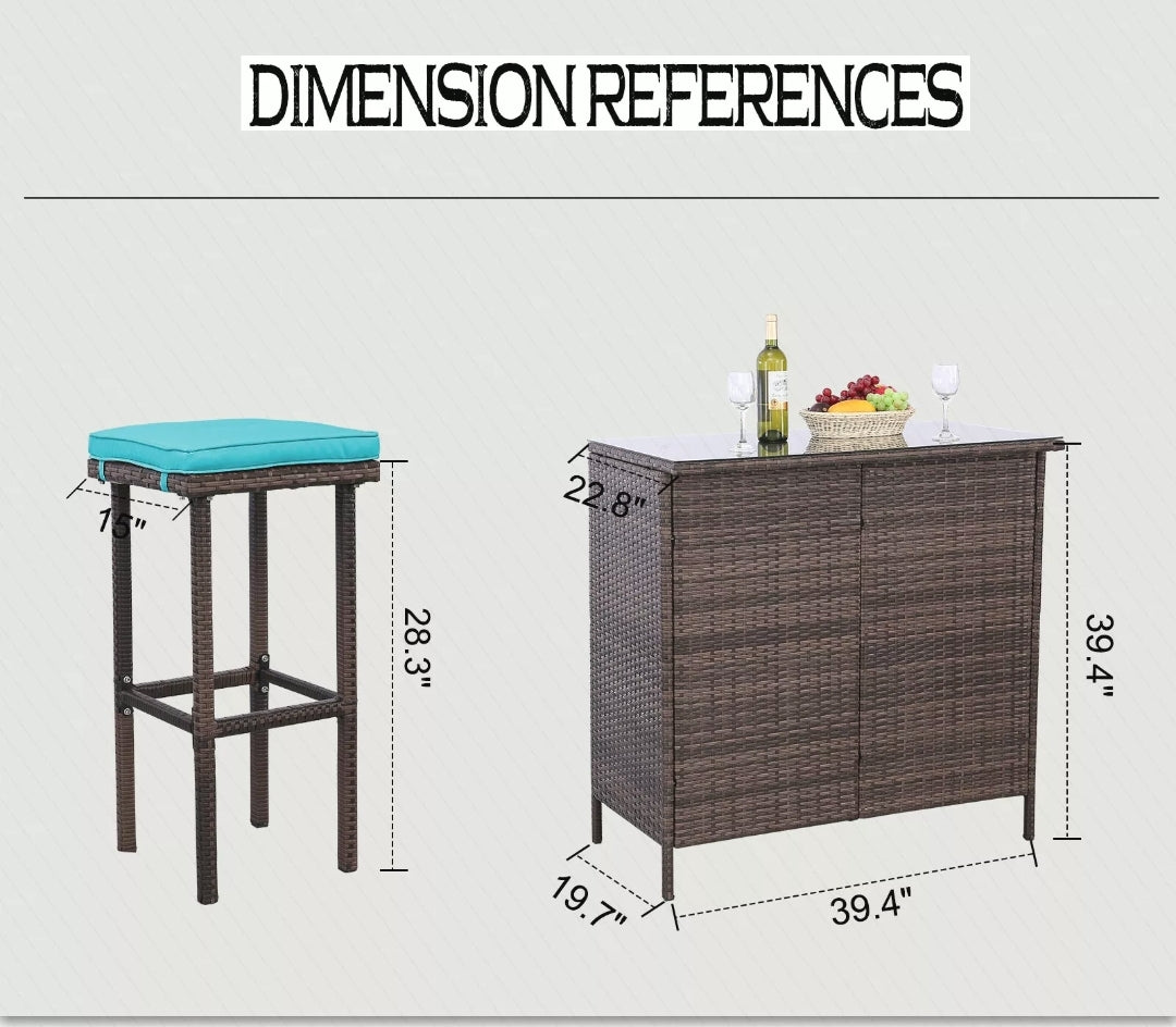 3 Piece Outdoor Wicker Bar Stools Set Patio Rattan Furniture Set with Cushions