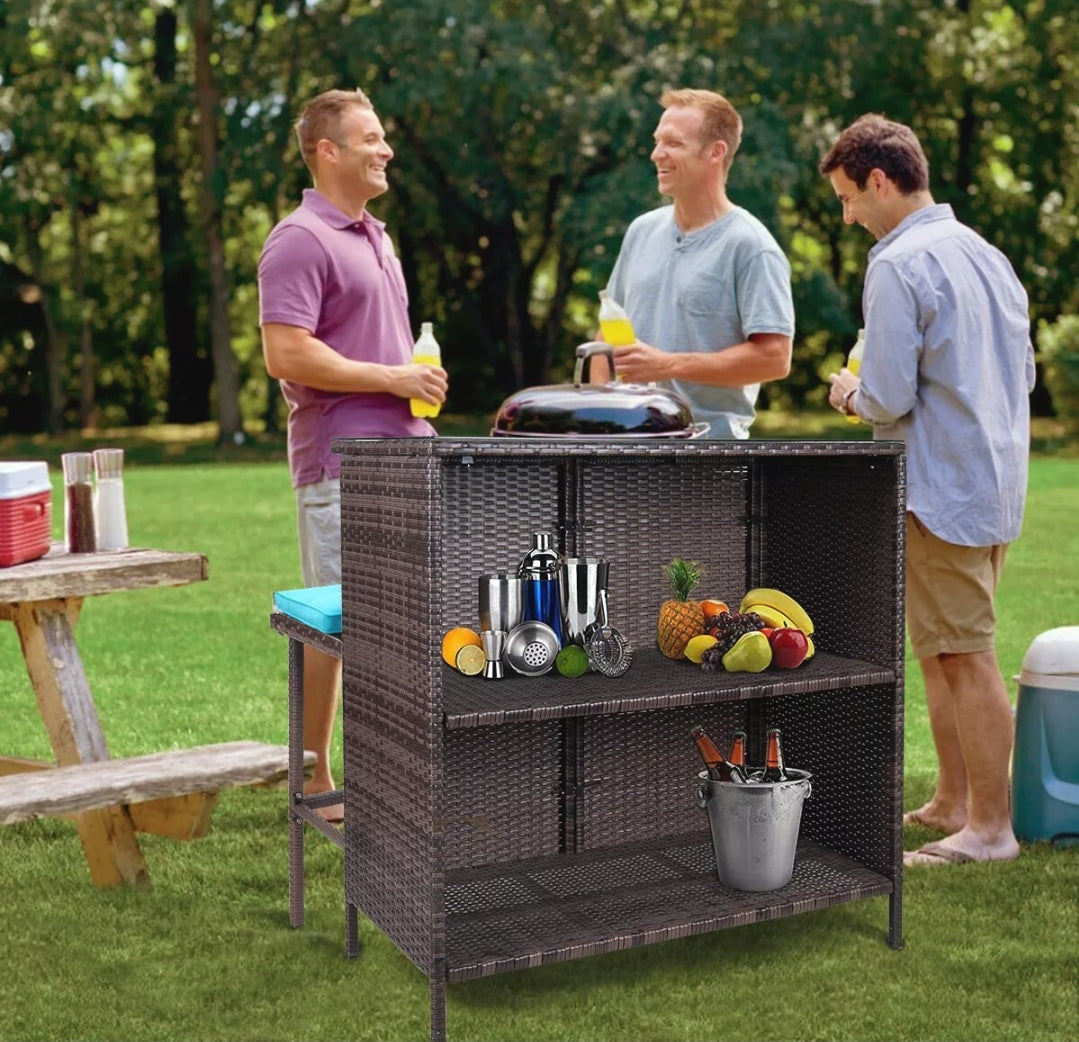- Elegant Glass Top: Bar table has a glass top for convenient placement of drinks on a flat surface ,matches seamlessly with the brown wicker. The bar comes with two 16.5” tall shelves. This space is ideal for storing drinks, mixers, ice, dishes, cutlery or anything else!