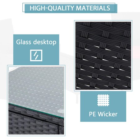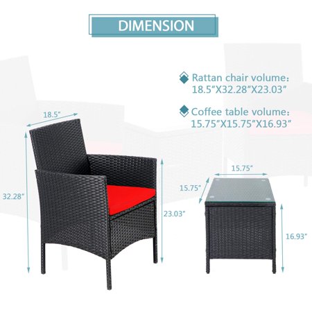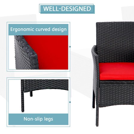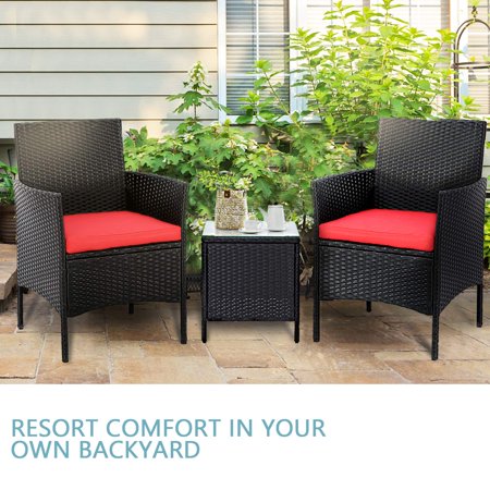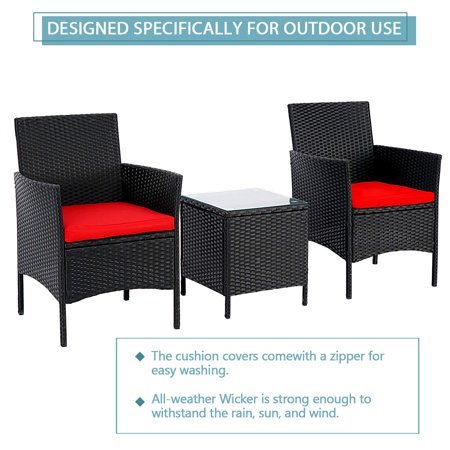 3-Piece Patio Outdoor Bistro Furniture Set, All-Weather Black Wicker Chairs and Glass Side Table, Red Cushion