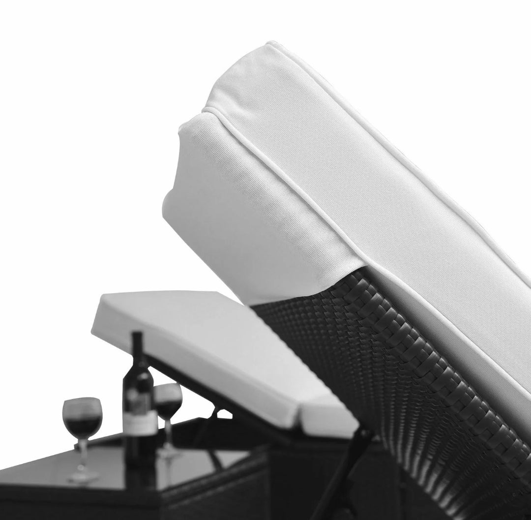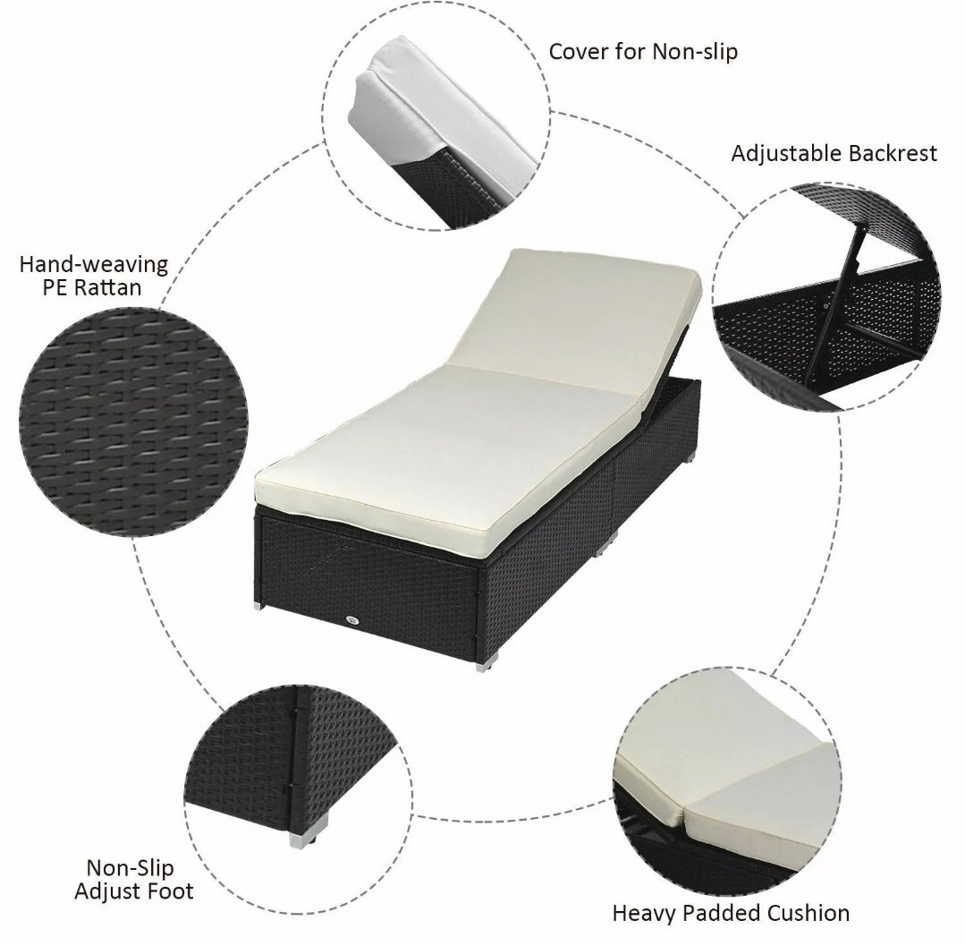 - The Outsunny 3 piece chaise lounge set is an affordable alternative to high priced rattan outdoor furniture. Made of high quality PE wicker rattan these chaise lounges look amazing enough for inside your home, but are rugged enough to handle anything Mother Nature can throw at them. The back has 5 different positions it can be adjusted too, ensuring that you will find degree of comfort. The included matching table looks great and completes the overall look of elegant sophistication. For the best value for your money you are going to be hard pressed to find something better than this chaise lounge set.
