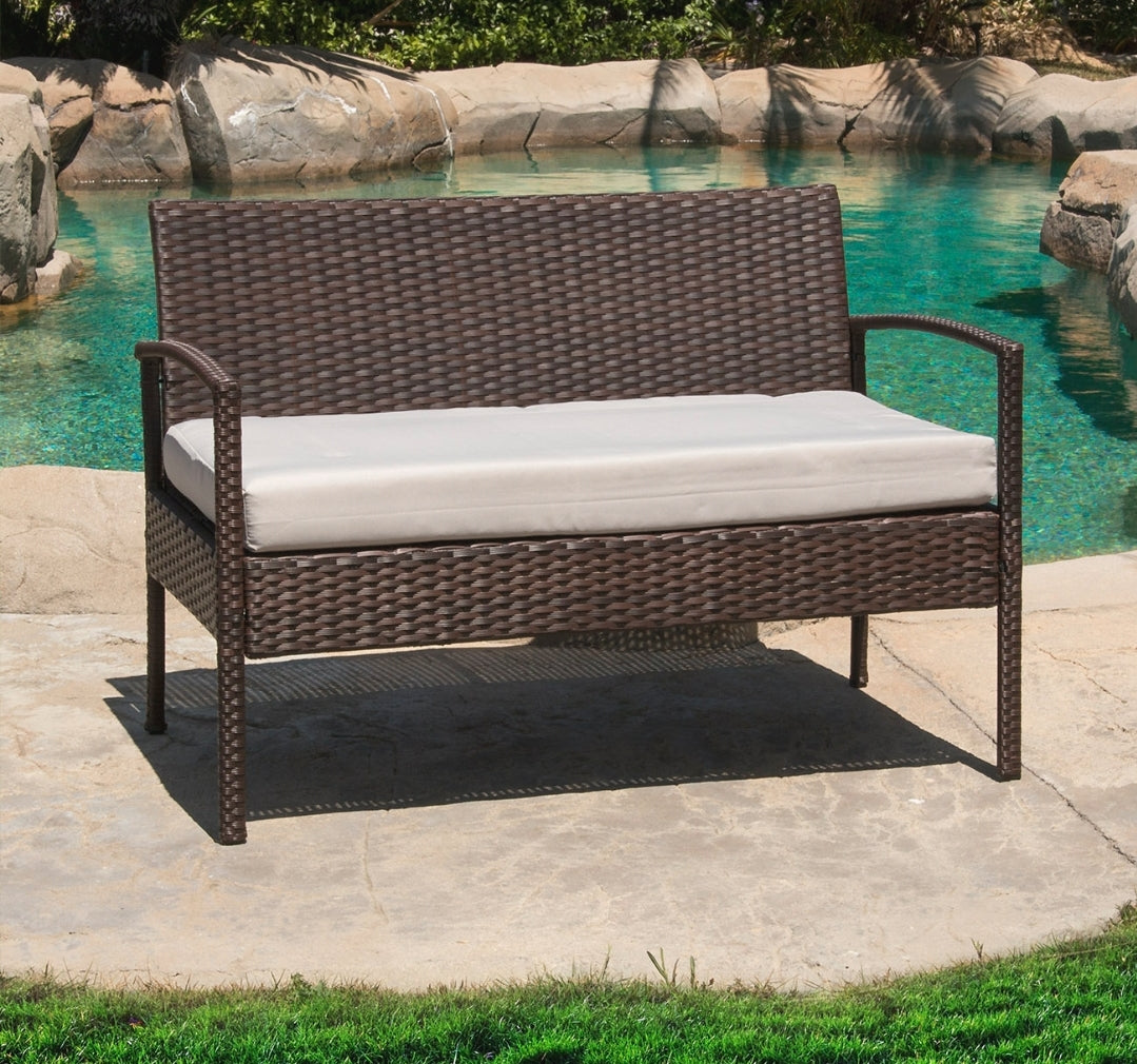 Patio 4 piece set feature a outdoor weatherproof bench, chairs and table set offers you a quiet, cozy space outdoors to host a conversations, read a book, enjoy morning coffee or whatever else you should find to do outdoors. Complete with seat cushions, it includes one sofa, two chair and a coffee table with tempered glass. The pattern on the chairs adds eye catching detail. Perfect for year round enjoyment.