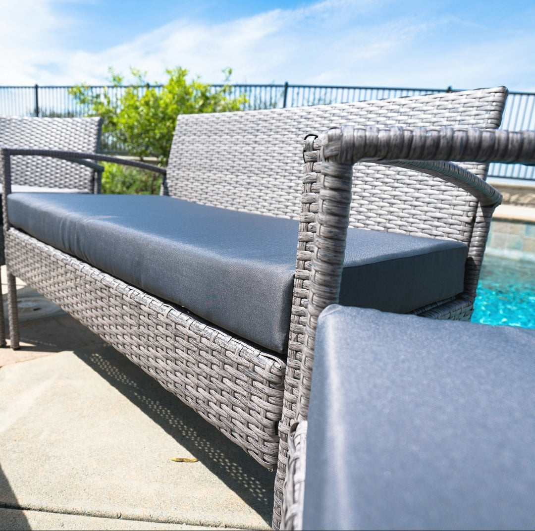 Patio 4 piece set feature a outdoor weatherproof bench, chairs and table set offers you a quiet, cozy space outdoors to host a conversations, read a book, enjoy morning coffee or whatever else you should find to do outdoors. Complete with seat cushions, it includes one sofa, two chair and a coffee table with tempered glass. The pattern on the chairs adds eye catching detail. Perfect for year round enjoyment.