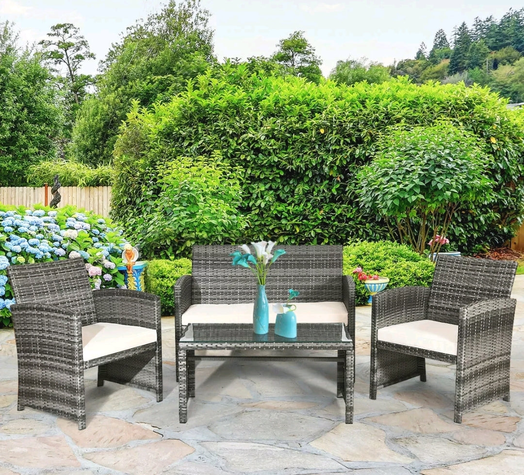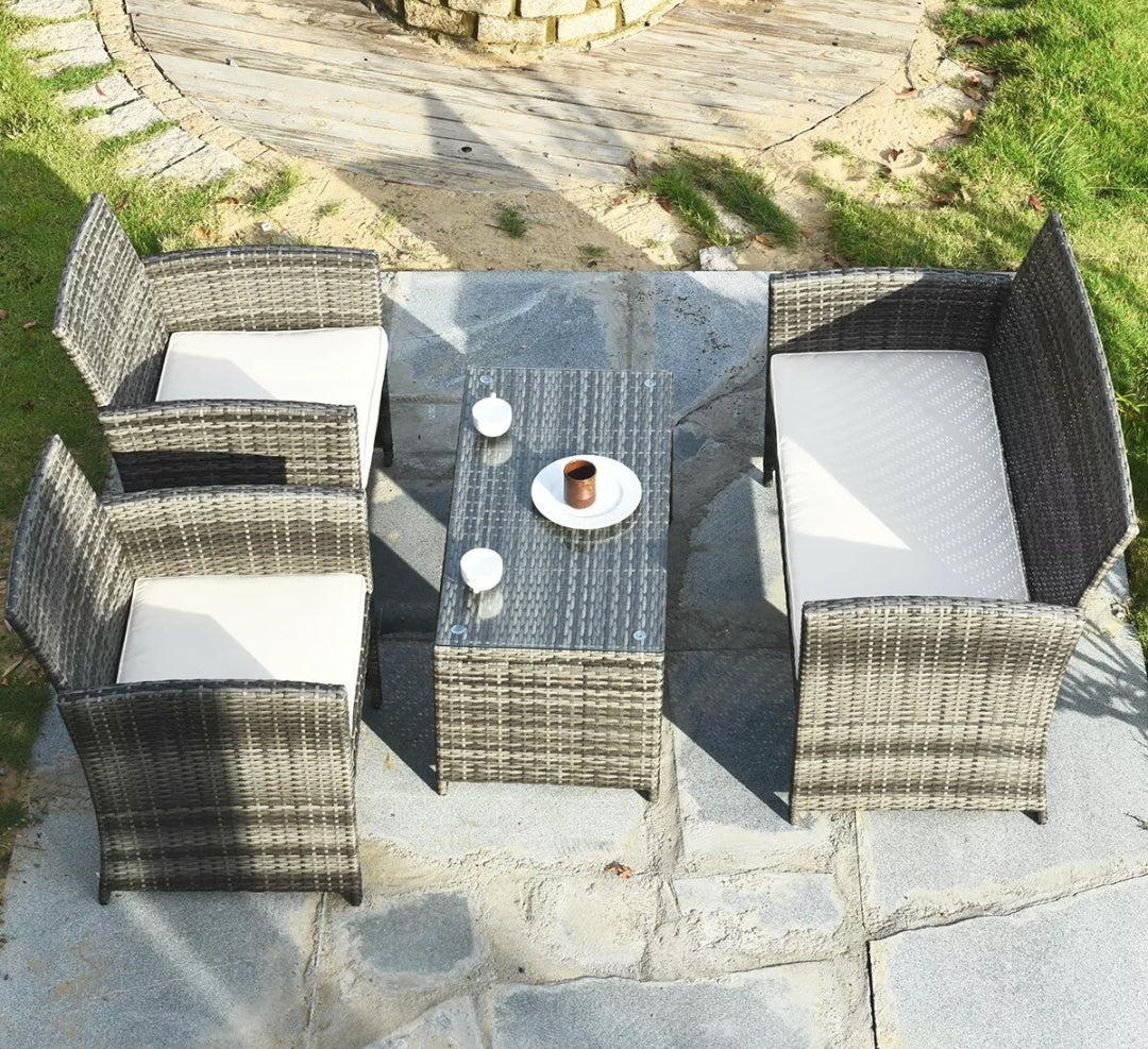 The most stylish rattan wicker furniture gives your garden a new look. Our 4 piece rattan furniture includes one bench, two single sofas and a coffee table with tempered tabletop. Our patio rattan set made of premium steel and rattan that are ensured to last long. The thickly cushioned patio sofa set chairs for maximum comfort and excellent seating experience. If the cushions get dirty, you can simply zip off the cushions covers and wash the covers. Besides, the table top is made of tempered glass, so you can wipe it off with damp cloth. This set of rattan furniture can be placed in your courtyard, balcony and poolside to have a gathering or conversation with drinks.