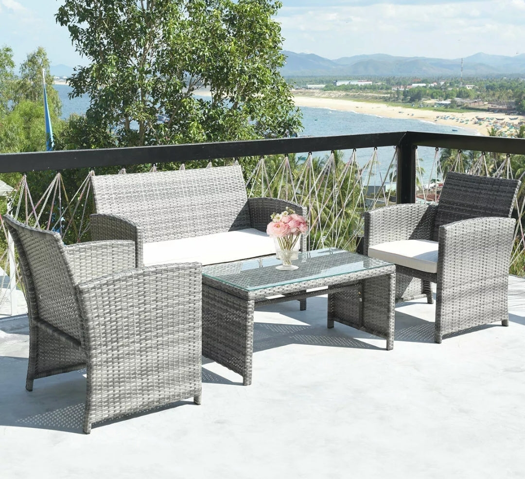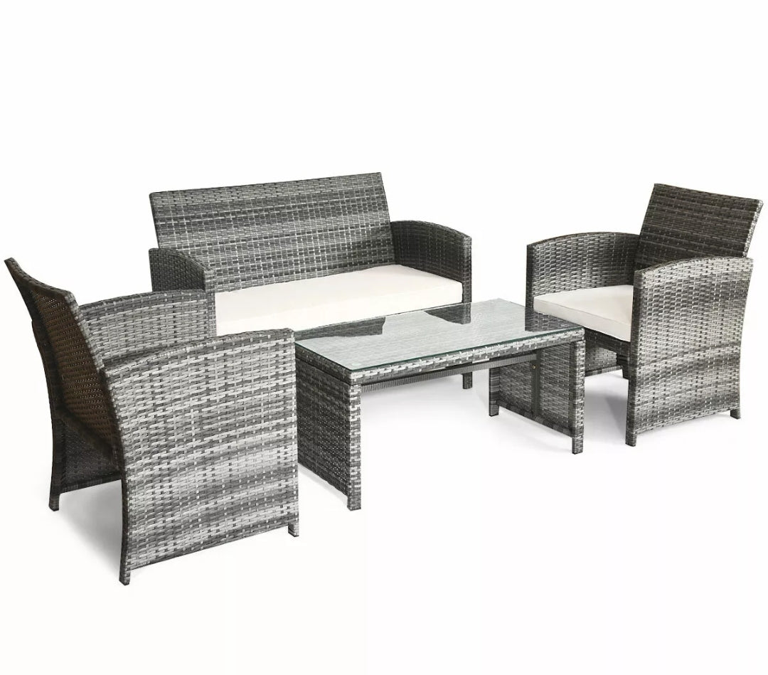 4PCS Gray Patio Rattan Furniture Set Conversation Glass Tabletop Cushioned Sofa Yard