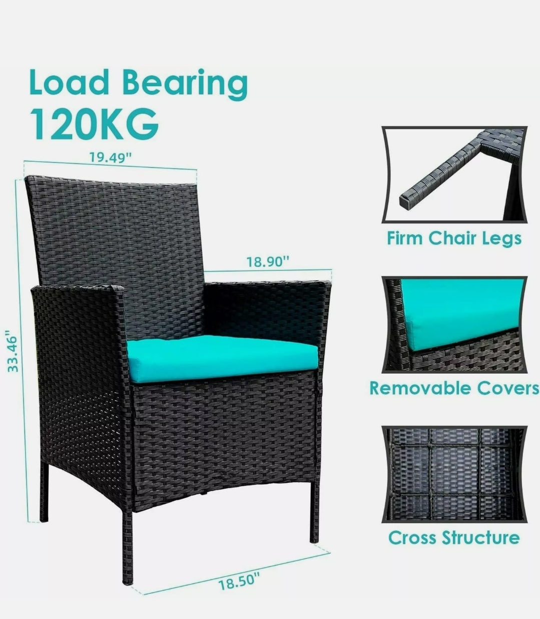 The Outdoor Patio Furniture Set is made of black waterproof PE rattan with a rust-proof steel frame. PE rattan is superior to traditional wicker materials, is chemical and UV resistant, and will not fade. It is extremely hard-wearing, so you can use it without worry. Each chair can support up to 286 pounds. The comfortable foam upholstery comes with a removable 100% spun polyester fabric cover for easy cleaning, and the tempered glass on the table makes cleaning easy, so if tea or coffee drips on it, it can be scrubbed or cleaned with water.