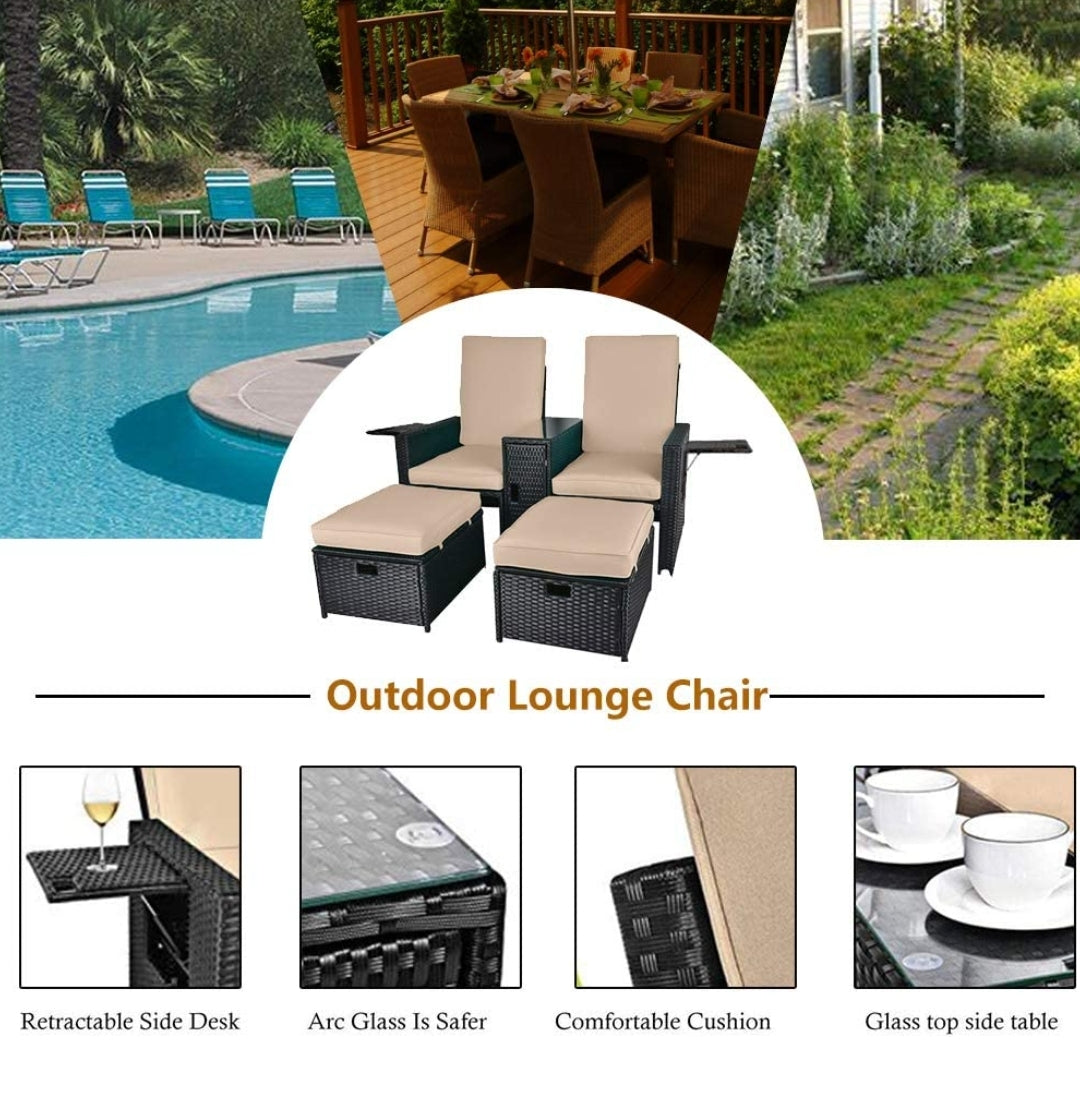 5PCS Outdoor Wicker Chaise Lounge Chair - Rattan Adjustable Reclining Patio Lounge Chair with Ottoman and Coffee Table, for Patio Beach Pool Backyard (Black Wicker Khaki Cushion