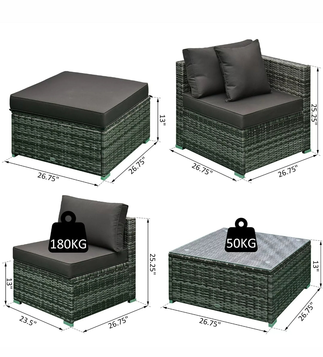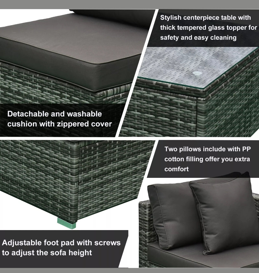 - With modern and stylish lines, this beautiful rattan wicker patio furniture set offers quality and comfort for lounging at its best. Our sofa and chaise furniture sets are amply padded, stable and the cushions are designed to be breathable. Perfect for the patio, deck or poolside, these cushioned seats will invite you and your guests to sit back, relax and enjoy the great outdoors. The 6 included pieces of our rattan furniture are infinitely reconfigurable, allowing you to rearrange whenever you need too or even just when the mood strikes. The cushions have removable covers for easy cleaning. With a strong steel frame and gorgeous all-weather PE wicker, this sofa set is the one you are looking for.