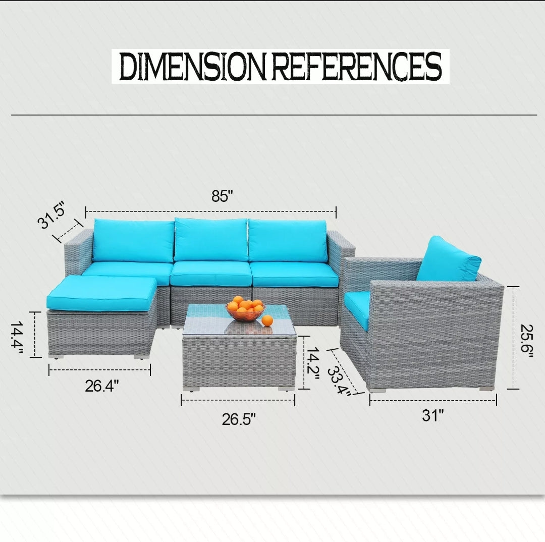 - Patio Sofa Set Including: 6pcs Rattan Sofa Set, Corner sofa: 2pcs with 3 inch cushions, Single Sofa: 1pc with 3 inch cushions,Middle sofa: 1pc with 3 inch cushions,Tea table: 1pc with 5mm clear tempered glass,Footrest: 1 pc with 10cm cushions, Clips and screws with tool
