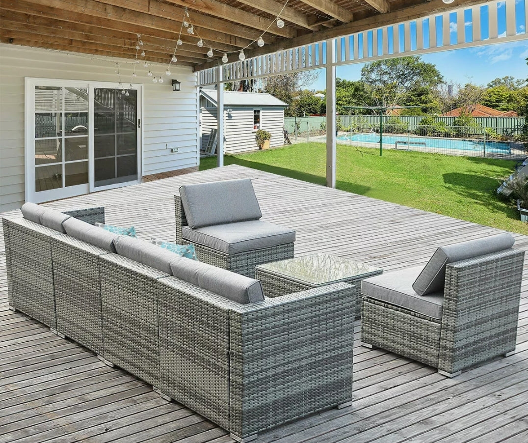 【Ergonomic & Comfortable】This contemporary outdoor sectional sofa comes equipped with soft, sponge cushions and pillows that offer maximum comfort and relaxation. The curved design provides ergonomic support to your back.