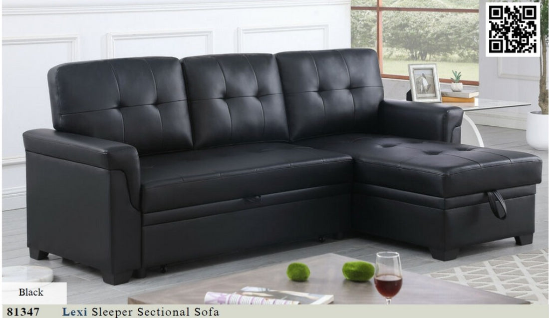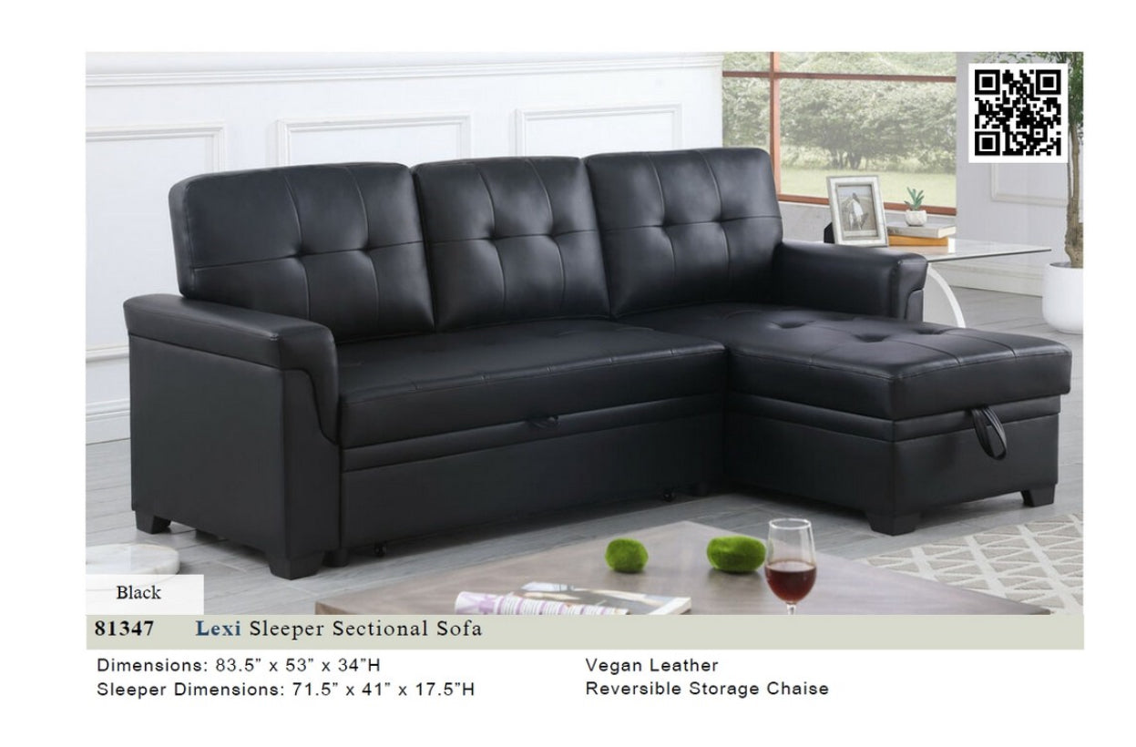81347 Lexi Black Leather Modern Reversible Sleeper Sectional Sofa