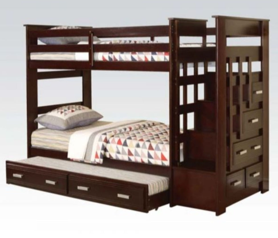 The Allentown Collection was designed to save space, this twin over twin bunk bed is a perfect solution for your childrens bedroom. The piece features a rich espresso finish and offers durability as well as a clean style. The full-length guard rails provide safety. The included staircase allows easy access to the top bunk. For additional storage convenience, this set is complemented by the staircase drawers, and convertible trundle storage drawer, which can be easily be transformed into a pull-out twin size bed by just removing the center panel board.