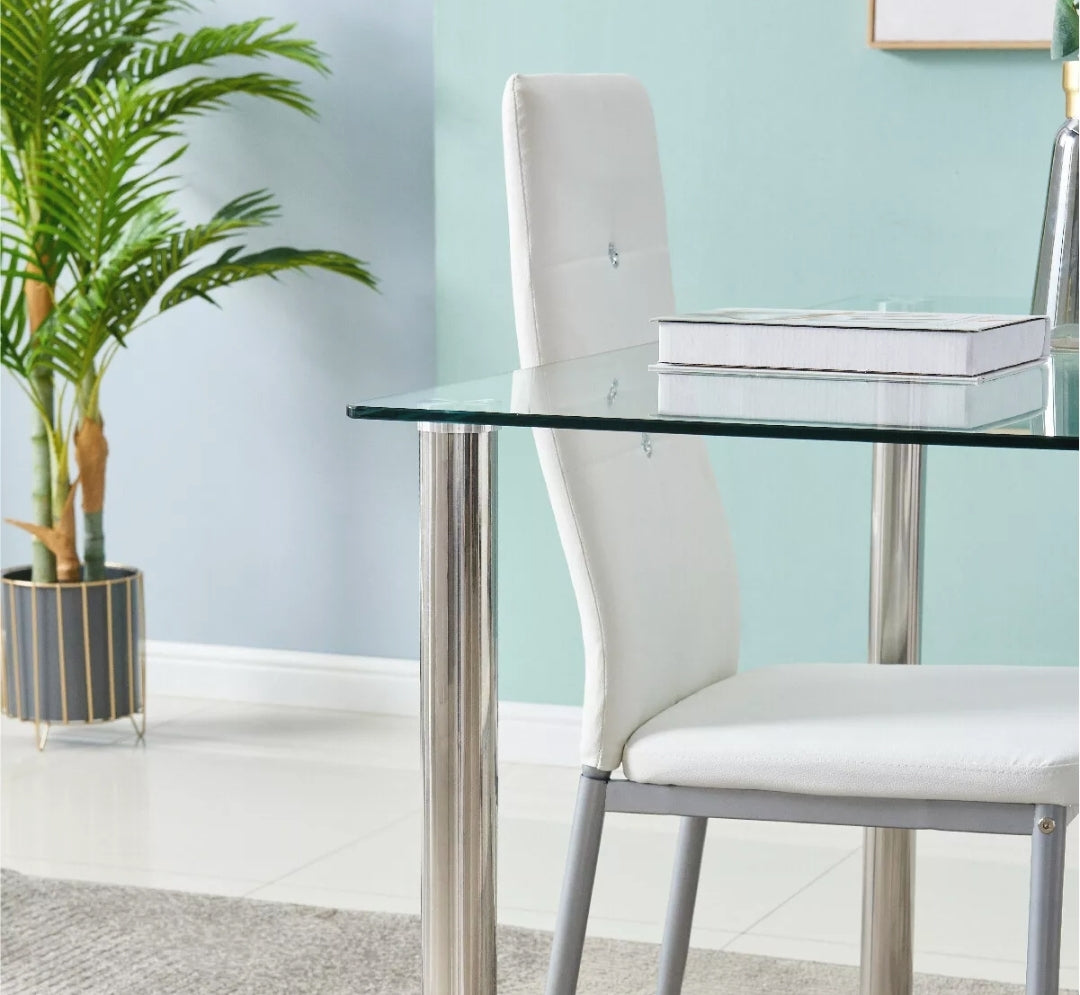 This is our modern and stylish dining table and chair set, using high-quality materials and exquisite craftsmanship. The table top uses 8mm tempered glass, and the smooth and transparent surface is waterproof and scratch-resistant, easy to clean. The dining chair uses high-quality PU fabric, the entire sponge padding, wear-resistant and comfortable, and the high-back design is also very ergonomic. The metal frame of the table legs and chair legs provides extra support, strong load-bearing capacity and long product life.