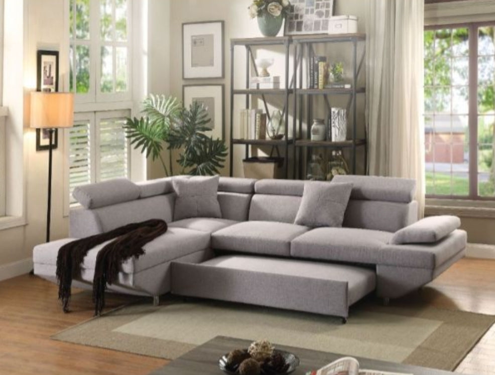 Sweet relaxation is all yours with this Jemima versatile sectional sofa. Enjoy lounging with its cushioned seats or adjust the headrests and arm rests, which allow you to fully stretch out and take a breather from the long day. Upholstered in cozy gray fabric and filled with foam cushions, this L shaped sectional adds functionality with its optional pull-out sleeper. This sectional sofa is perfect for unexpected guests and is necessary in every home.