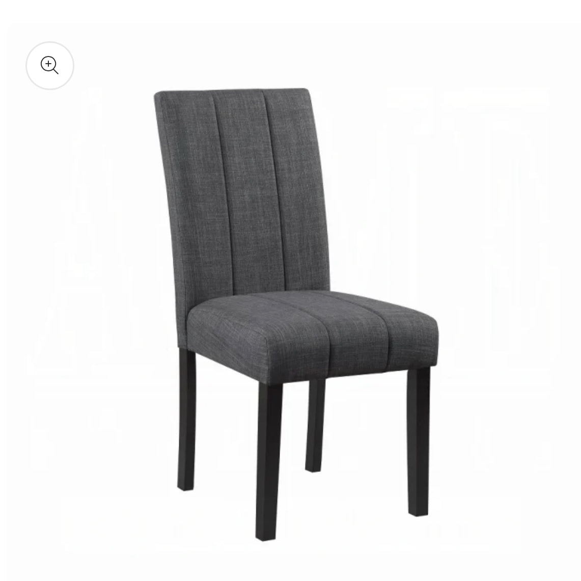 This elegant, contemporary, five-piece dining set completes formal dining experiences with a round, white, cultured marble, and rustic espresso pedestal table and four upholstered parson style side chairs. Charming details like button-tufted rolled backrests, bold nailhead trim, and flared legs lend a classical approach with modern elements.